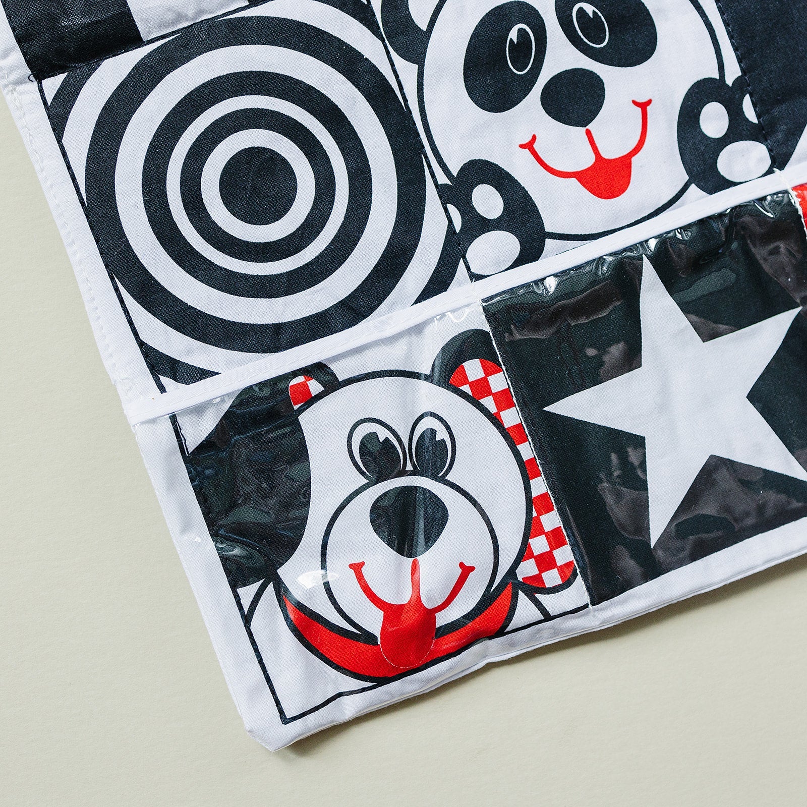 - Side 1: 9 panels in high contrast patterns and faces with graduated complexity; features 3 vinyl pocket to stores small items and 1 baby-safe mirror. Side 2: Picture of elephant, dog and car in a car.