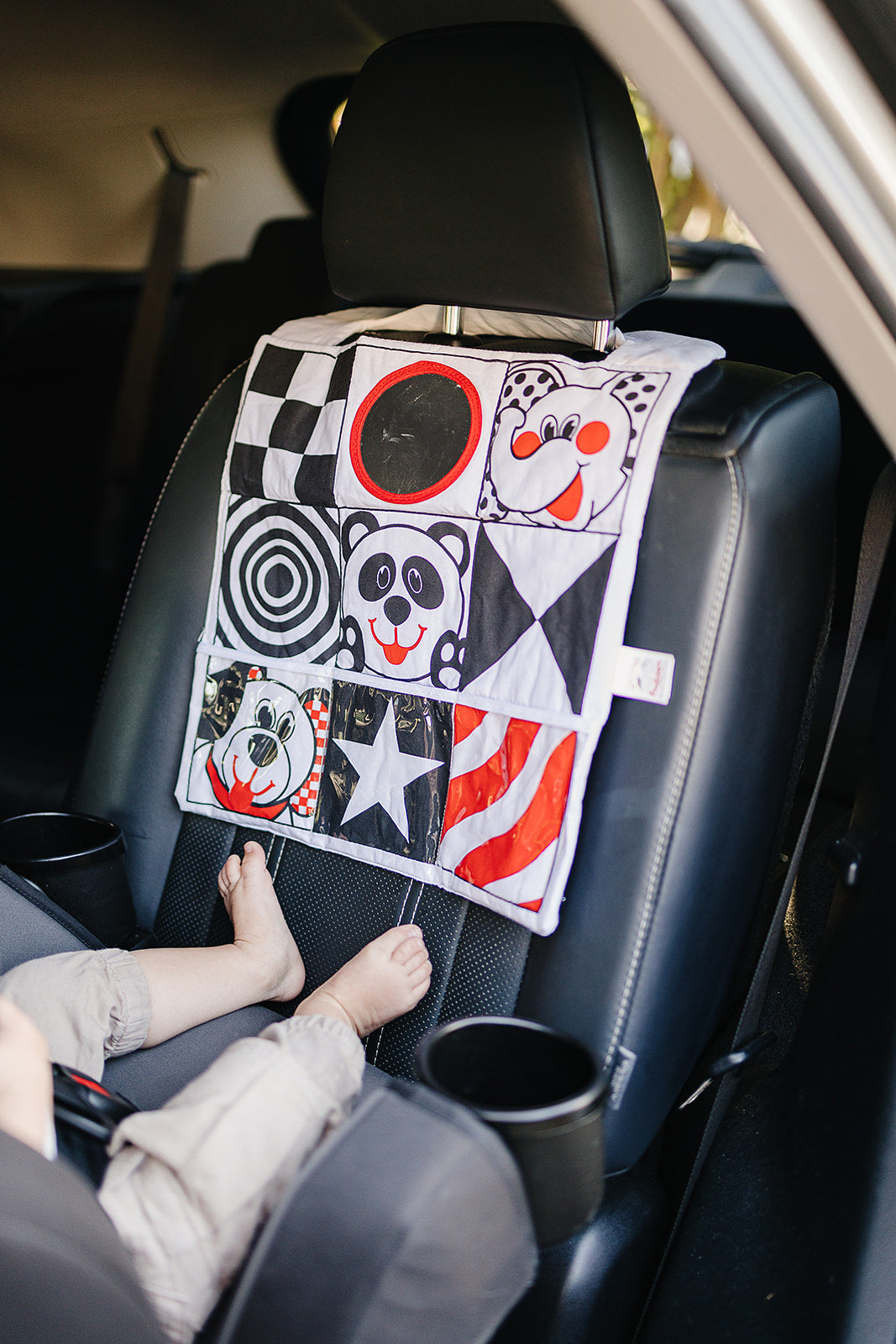 Details: Car rides with a newborn or infant can be stressful at first. Some babies naturally love car rides while others need to be entertained with car toys for babies. If your baby is the latter, look no further than Genius Baby Toys' baby car activity center. We specifically designed this lightweight, portable carseat toy with high contrast images in black, white and red, the first three colors that a newborn baby can best perceive. We also included a small, baby-safe mirror in one of the panels because babies are fascinated by faces and reflections. Flip this reversible activity center to the other side to find more images of animals, like dogs and elephants. We also know that new parents are busy and stressed so we made our infant car seat toy easy to attach. Just put the strap around a car headrest and secure with the velcro closure. It takes less than a minute to do and can be easily removed if you need to move it to a different car or to clean it with a damp cloth. Looking for more ideas? Check out Genius Baby Toys' baby spiral hanging stroller and car seat toys and other toys in our signature High Contrast Black, White and Red Collection.