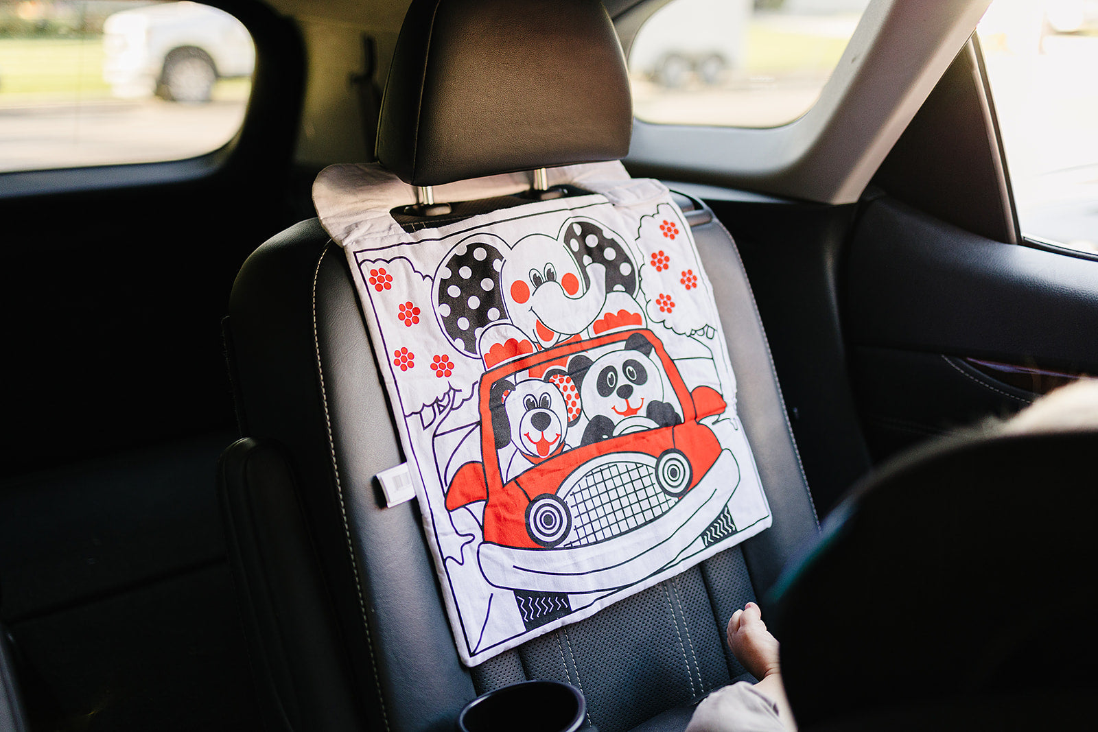 - We designed this contrast carseat toy so that it's quick and easy to attach to a car headrest. Just velcro the strap around the headrest and you're ready to go.