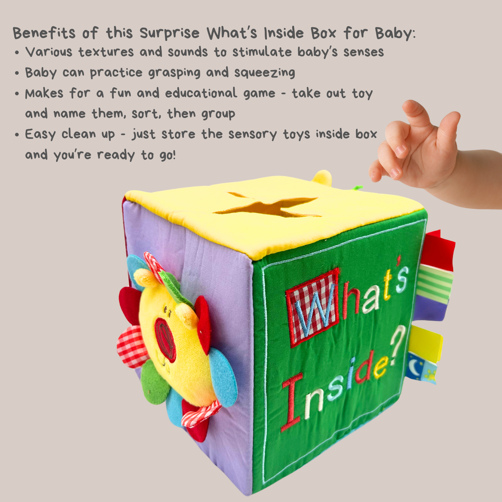 - Each toy in our What's Inside Soft Feely Box is colorful with various textures, a baby-safe mirror and toys that rattle and crinkle, teaching your baby to grasp and understand object permanence.