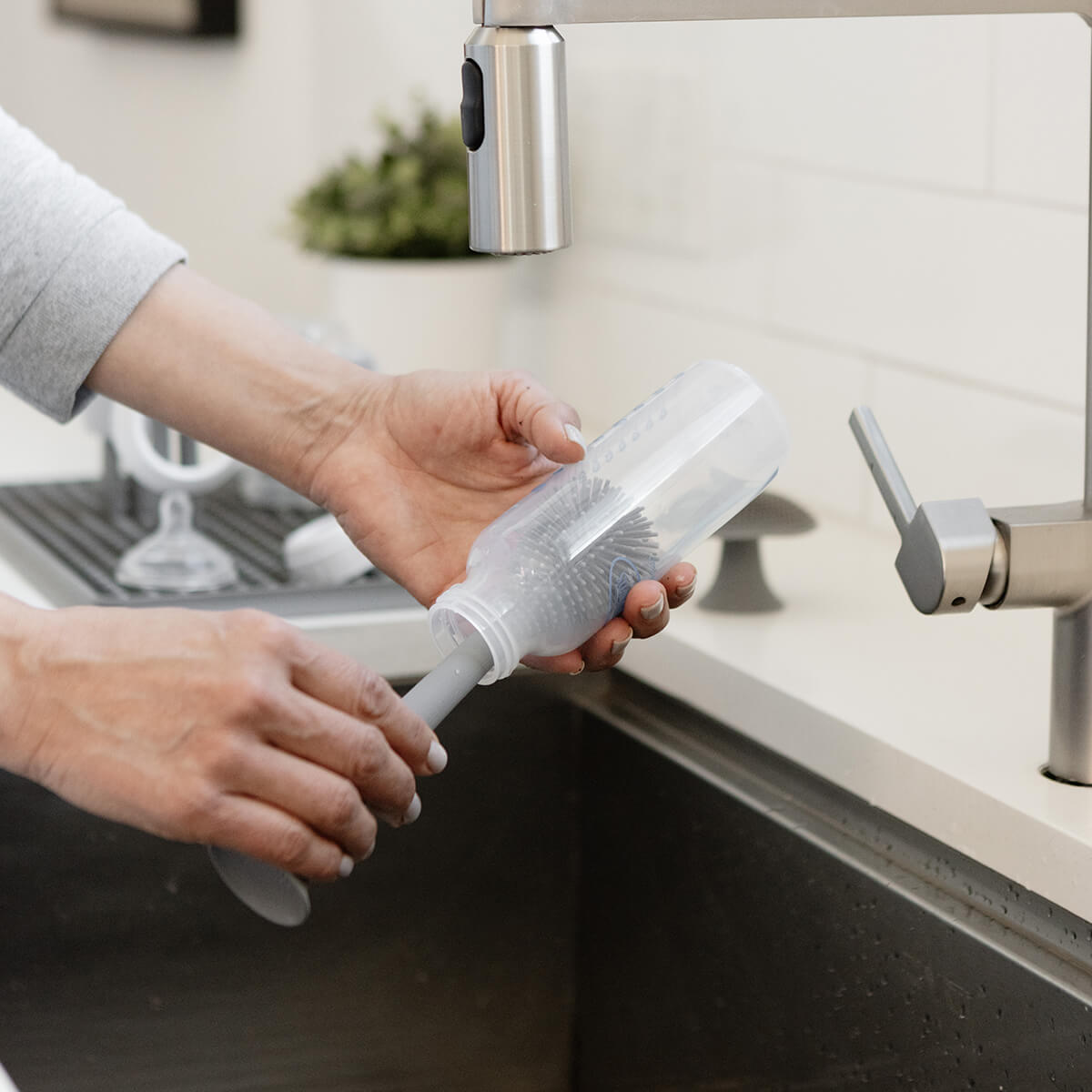 The Bottle Brush was designed to clean bottles, water bottles, cups, and cookware. Due to the silicone material, the Bottle Brush is hypo-allergenic, odor-resistant, and long-lasting.